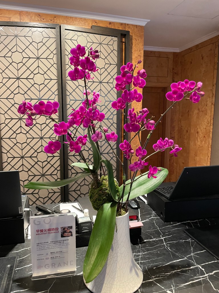 When you walk into the Grand Hyatt Taipei, a single, grand centerpiece, an astounding floral display in the middle of a fountain that is crowned with an elaborate chandelier greets you. Over the course of our two-week stay, we got to witness an entire team of florists painstakingly change the entire floral display out, draining the fountain and carefully arranging every orchid, greenery and rose.
